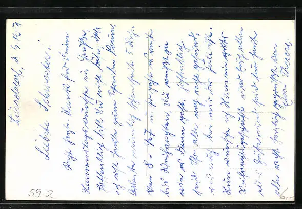 Personenbezogene Daten auf der Rückseite der Karte wurden durch blauen Textmarker unkenntlich gemacht. Die blauen Stellen sind auf die Vorderseite durchgeweicht und wirken sich negativ auf das Postkartenfoto aus