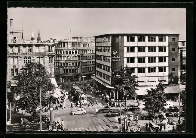 AK Düsseldorf, Corneliusplatz mit Geschäften und Strassenbahn