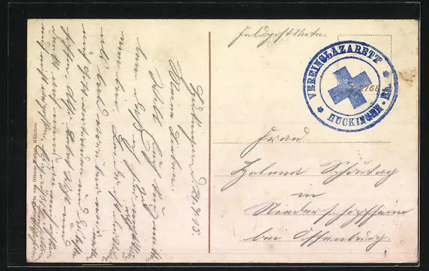 Personenbezogene Daten auf der Rückseite der Karte wurden durch blauen Textmarker unkenntlich gemacht. Die blauen Stellen sind auf die Vorderseite durchgeweicht und wirken sich negativ auf das Postkartenfoto aus