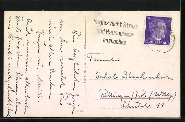 Personenbezogene Daten auf der Rückseite der Karte wurden durch blauen Textmarker unkenntlich gemacht. Die blauen Stellen sind auf die Vorderseite durchgeweicht und wirken sich negativ auf das Postkartenfoto aus