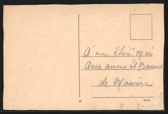 Personenbezogene Daten auf der Rückseite der Karte wurden durch blauen Textmarker unkenntlich gemacht. Die blauen Stellen sind auf die Vorderseite durchgeweicht und wirken sich negativ auf das Postkartenfoto aus