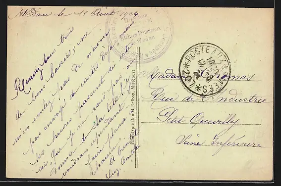 Personenbezogene Daten auf der Rückseite der Karte wurden durch blauen Textmarker unkenntlich gemacht. Die blauen Stellen sind auf die Vorderseite durchgeweicht und wirken sich negativ auf das Postkartenfoto aus