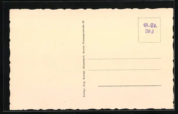 Personenbezogene Daten auf der Rückseite der Karte wurden durch blauen Textmarker unkenntlich gemacht. Die blauen Stellen sind auf die Vorderseite durchgeweicht und wirken sich negativ auf das Postkartenfoto aus