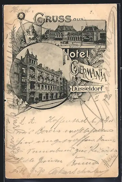 AK Düsseldorf, Hotel Germania, Bahnof, Passepartout mit Eichenzweig