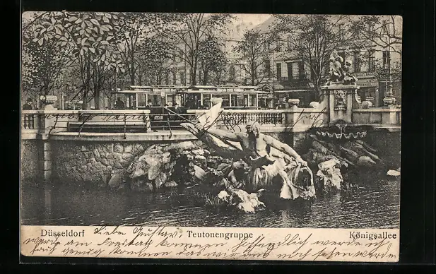 AK Düsseldorf, Königsallee mit Strassenbahn und Teutonengruppe