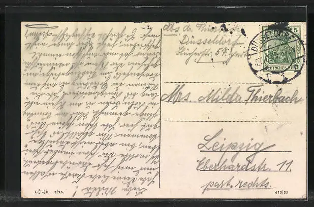 Personenbezogene Daten auf der Rückseite der Karte wurden durch blauen Textmarker unkenntlich gemacht. Die blauen Stellen sind auf die Vorderseite durchgeweicht und wirken sich negativ auf das Postkartenfoto aus