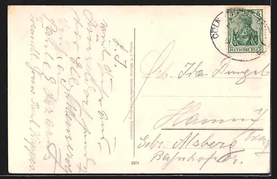Personenbezogene Daten auf der Rückseite der Karte wurden durch blauen Textmarker unkenntlich gemacht. Die blauen Stellen sind auf die Vorderseite durchgeweicht und wirken sich negativ auf das Postkartenfoto aus