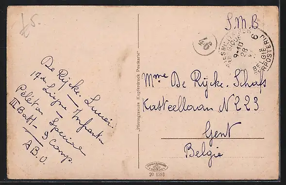 Personenbezogene Daten auf der Rückseite der Karte wurden durch blauen Textmarker unkenntlich gemacht. Die blauen Stellen sind auf die Vorderseite durchgeweicht und wirken sich negativ auf das Postkartenfoto aus