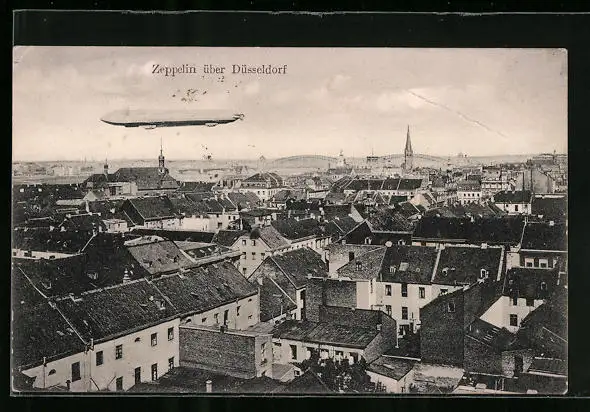 AK Düsseldorf, Ortsansicht aus der Vogelschau mit Zeppelin