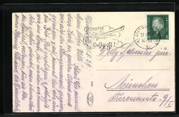 Personenbezogene Daten auf der Rückseite der Karte wurden durch blauen Textmarker unkenntlich gemacht. Die blauen Stellen sind auf die Vorderseite durchgeweicht und wirken sich negativ auf das Postkartenfoto aus