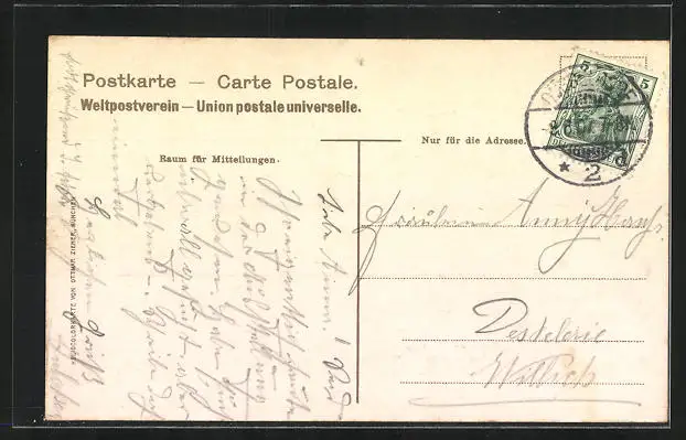 gelaufen 1907, Eckknicke re. unten, guter Zustand