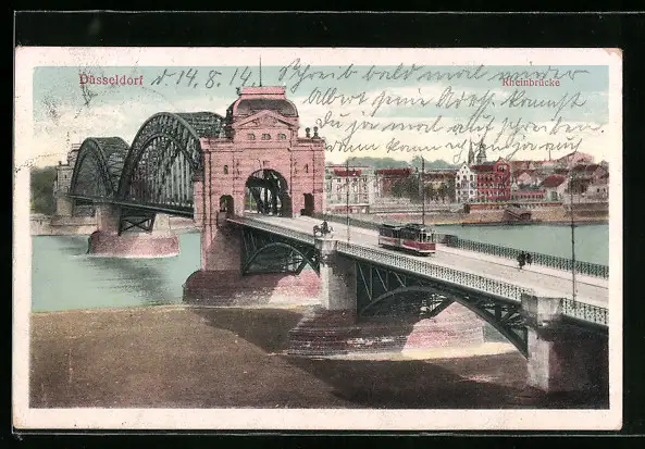 AK Düsseldorf, Rheinbrücke mit Strassenbahn