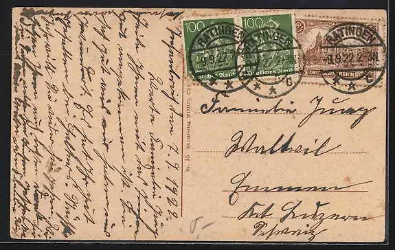 alte Ansichtskarte, gelaufen 1922, Eckknicke li., minimaler Einriss li. oben, guter Zustand