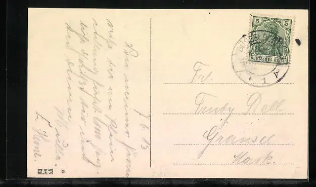 Personenbezogene Daten auf der Rückseite der Karte wurden durch blauen Textmarker unkenntlich gemacht. Die blauen Stellen sind auf die Vorderseite durchgeweicht und wirken sich negativ auf das Postkartenfoto aus
