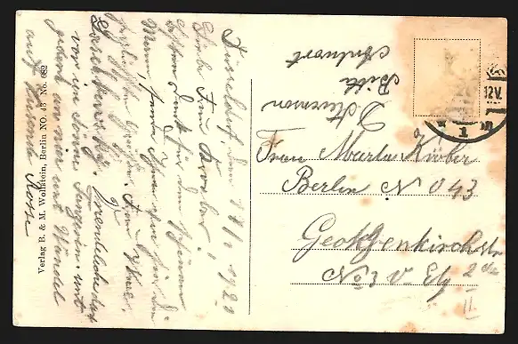 Personenbezogene Daten auf der Rückseite der Karte wurden durch blauen Textmarker unkenntlich gemacht. Die blauen Stellen sind auf die Vorderseite durchgeweicht und wirken sich negativ auf das Postkartenfoto aus