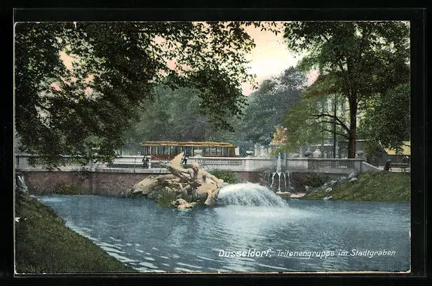 AK Düsseldorf, Tritengruppe im Stadtgraben mit Strassenbahn