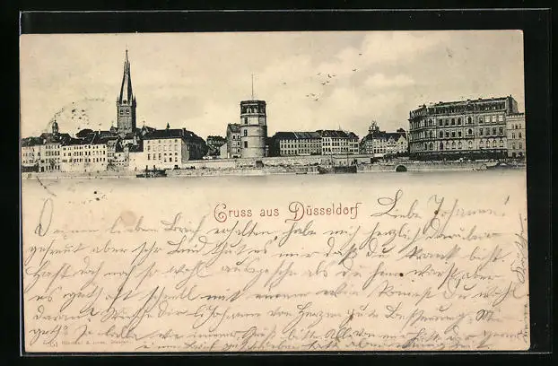 AK Düsseldorf, Uferpartie mit Kirche