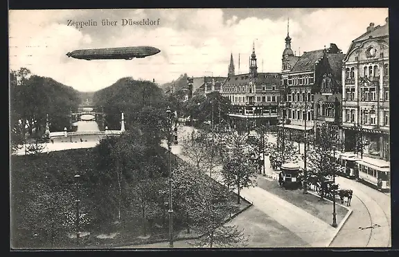 AK Düsseldorf, Zeppelin fliegt über die Strassenbahn
