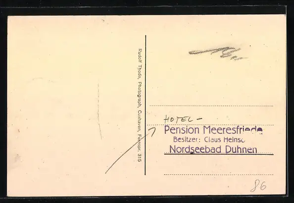 Personenbezogene Daten auf der Rückseite der Karte wurden durch blauen Textmarker unkenntlich gemacht. Die blauen Stellen sind auf die Vorderseite durchgeweicht und wirken sich negativ auf das Postkartenfoto aus