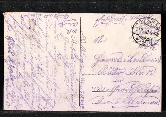 alte Ansichtskarte, gelaufen 1918 als Feldpost, Abriebspur li. oben und, Eckknick li. oben, guter Zustand