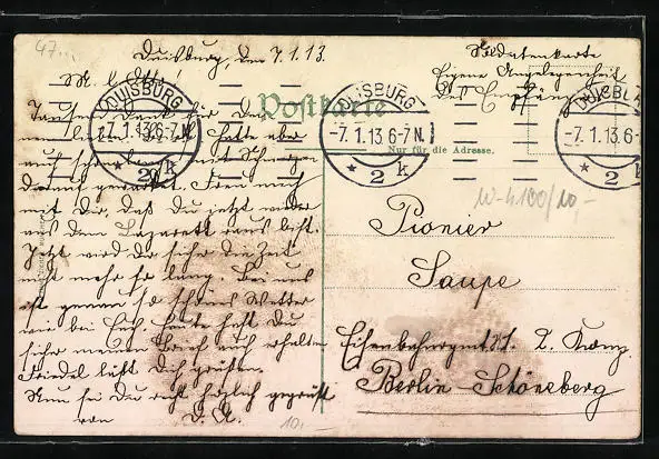 Personenbezogene Daten auf der Rückseite der Karte wurden durch blauen Textmarker unkenntlich gemacht. Die blauen Stellen sind auf die Vorderseite durchgeweicht und wirken sich negativ auf das Postkartenfoto aus