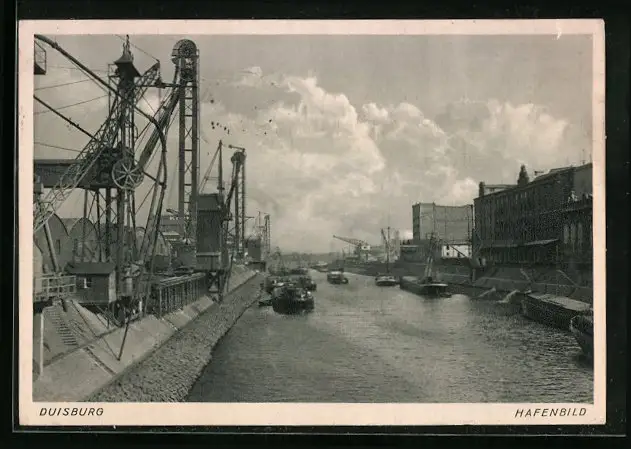 AK Duisburg, Hafenpartie mit Frachtern und Kränen