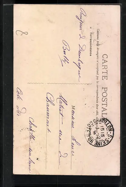 Personenbezogene Daten auf der Rückseite der Karte wurden durch blauen Textmarker unkenntlich gemacht. Die blauen Stellen sind auf die Vorderseite durchgeweicht und wirken sich negativ auf das Postkartenfoto aus