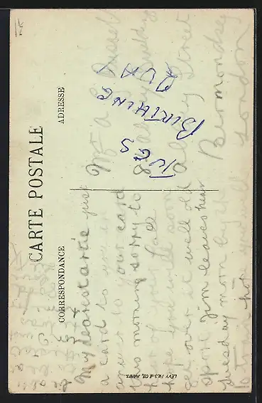 Personenbezogene Daten auf der Rückseite der Karte wurden durch blauen Textmarker unkenntlich gemacht. Die blauen Stellen sind auf die Vorderseite durchgeweicht und wirken sich negativ auf das Postkartenfoto aus