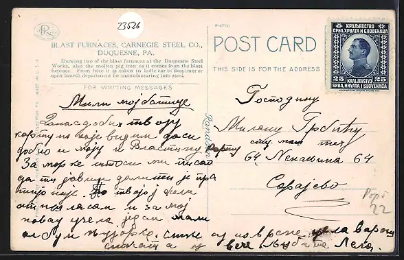 Personenbezogene Daten auf der Rückseite der Karte wurden durch blauen Textmarker unkenntlich gemacht. Die blauen Stellen sind auf die Vorderseite durchgeweicht und wirken sich negativ auf das Postkartenfoto aus
