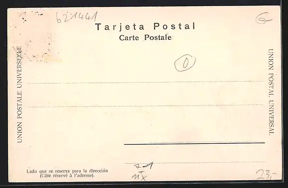 Personenbezogene Daten auf der Rückseite der Karte wurden durch blauen Textmarker unkenntlich gemacht. Die blauen Stellen sind auf die Vorderseite durchgeweicht und wirken sich negativ auf das Postkartenfoto aus
