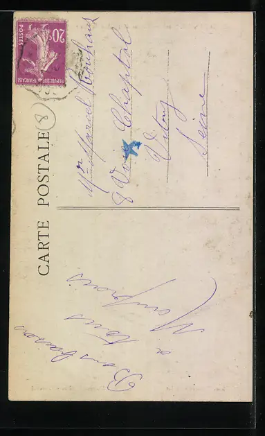 Personenbezogene Daten auf der Rückseite der Karte wurden durch blauen Textmarker unkenntlich gemacht. Die blauen Stellen sind auf die Vorderseite durchgeweicht und wirken sich negativ auf das Postkartenfoto aus