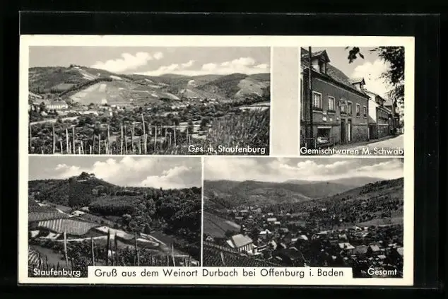 AK Durbach bei Offenburg i. Baden, Gemischtwaren M. Schwab, Staufenburg, Ortsansicht