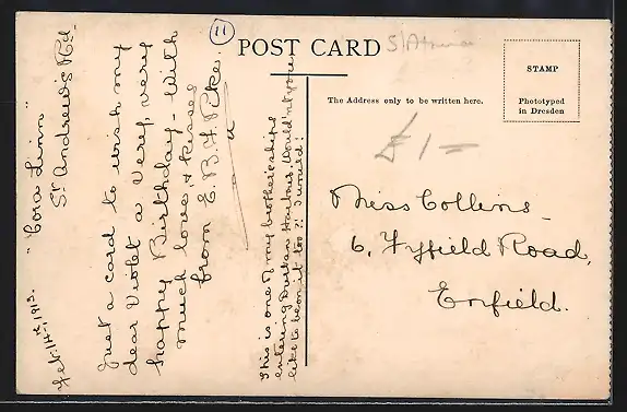 Personenbezogene Daten auf der Rückseite der Karte wurden durch blauen Textmarker unkenntlich gemacht. Die blauen Stellen sind auf die Vorderseite durchgeweicht und wirken sich negativ auf das Postkartenfoto aus