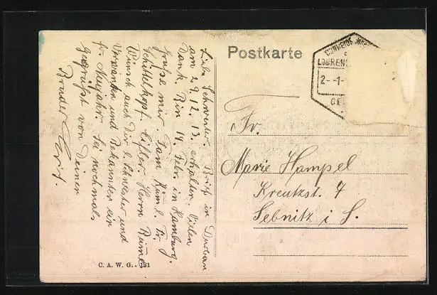 alte Ansichtskarte, gelaufen, Briefmarke entfernt, rückseitig Oberflächenschaden, Eckknick oben li., guter Zustand