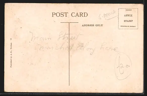 Personenbezogene Daten auf der Rückseite der Karte wurden durch blauen Textmarker unkenntlich gemacht. Die blauen Stellen sind auf die Vorderseite durchgeweicht und wirken sich negativ auf das Postkartenfoto aus
