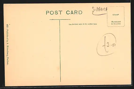 Personenbezogene Daten auf der Rückseite der Karte wurden durch blauen Textmarker unkenntlich gemacht. Die blauen Stellen sind auf die Vorderseite durchgeweicht und wirken sich negativ auf das Postkartenfoto aus