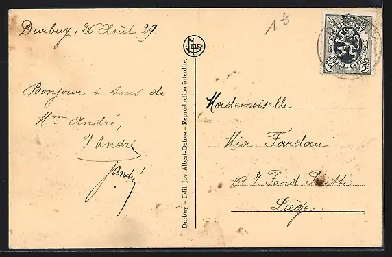 Personenbezogene Daten auf der Rückseite der Karte wurden durch blauen Textmarker unkenntlich gemacht. Die blauen Stellen sind auf die Vorderseite durchgeweicht und wirken sich negativ auf das Postkartenfoto aus