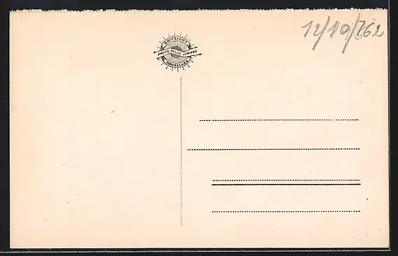 Personenbezogene Daten auf der Rückseite der Karte wurden durch blauen Textmarker unkenntlich gemacht. Die blauen Stellen sind auf die Vorderseite durchgeweicht und wirken sich negativ auf das Postkartenfoto aus
