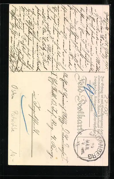 Personenbezogene Daten auf der Rückseite der Karte wurden durch blauen Textmarker unkenntlich gemacht. Die blauen Stellen sind auf die Vorderseite durchgeweicht und wirken sich negativ auf das Postkartenfoto aus