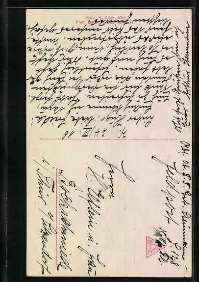 Personenbezogene Daten auf der Rückseite der Karte wurden durch blauen Textmarker unkenntlich gemacht. Die blauen Stellen sind auf die Vorderseite durchgeweicht und wirken sich negativ auf das Postkartenfoto aus