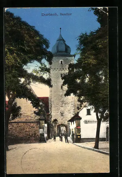 AK Durlach, Passanten vor dem Baseltor, Handlung von Ph. Meier