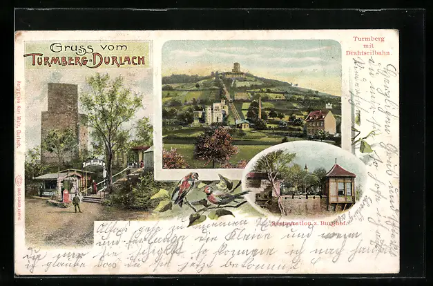 AK Durlach, Turmberg, Gasthaus z. Burghof, Turmberg mit Drahtseilbahn