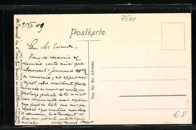 Personenbezogene Daten auf der Rückseite der Karte wurden durch blauen Textmarker unkenntlich gemacht. Die blauen Stellen sind auf die Vorderseite durchgeweicht und wirken sich negativ auf das Postkartenfoto aus