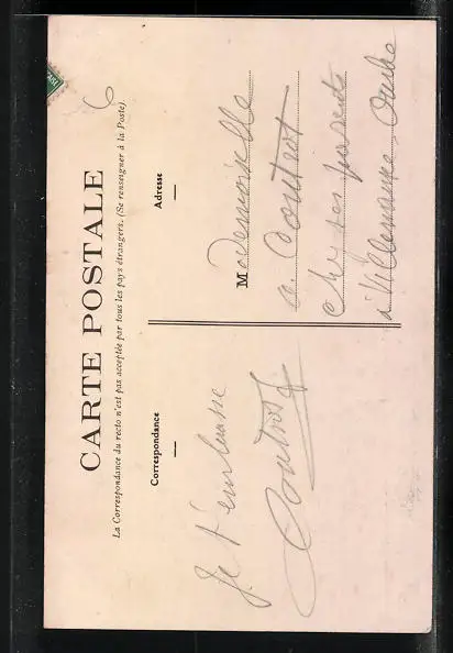 Personenbezogene Daten auf der Rückseite der Karte wurden durch blauen Textmarker unkenntlich gemacht. Die blauen Stellen sind auf die Vorderseite durchgeweicht und wirken sich negativ auf das Postkartenfoto aus