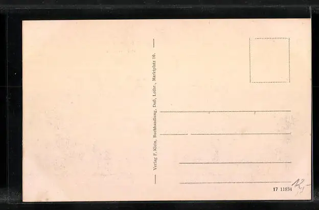 Personenbezogene Daten auf der Rückseite der Karte wurden durch blauen Textmarker unkenntlich gemacht. Die blauen Stellen sind auf die Vorderseite durchgeweicht und wirken sich negativ auf das Postkartenfoto aus