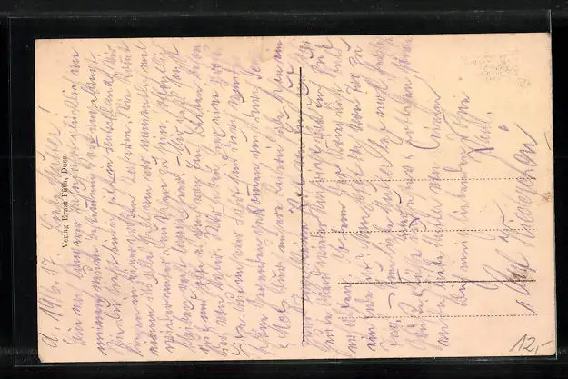 Personenbezogene Daten auf der Rückseite der Karte wurden durch blauen Textmarker unkenntlich gemacht. Die blauen Stellen sind auf die Vorderseite durchgeweicht und wirken sich negativ auf das Postkartenfoto aus