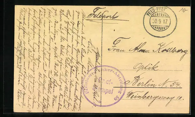 gelaufen 1917 als Feldpost, Eckknick re. unten, Bugspuren oben mittig u. li., guter Zustand