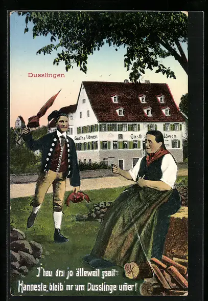 AK Dusslingen, Gasthaus zum Löwen, Mann und Frau in Tracht