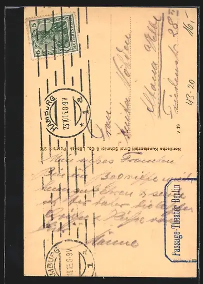 Personenbezogene Daten auf der Rückseite der Karte wurden durch blauen Textmarker unkenntlich gemacht. Die blauen Stellen sind auf die Vorderseite durchgeweicht und wirken sich negativ auf das Postkartenfoto aus