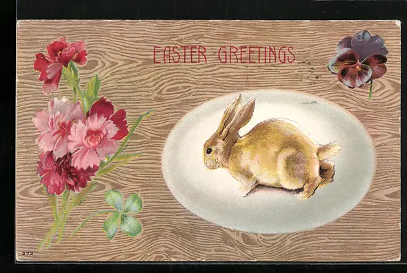 AK Easter Greetings, Osterhase mit Blumen-Motiv